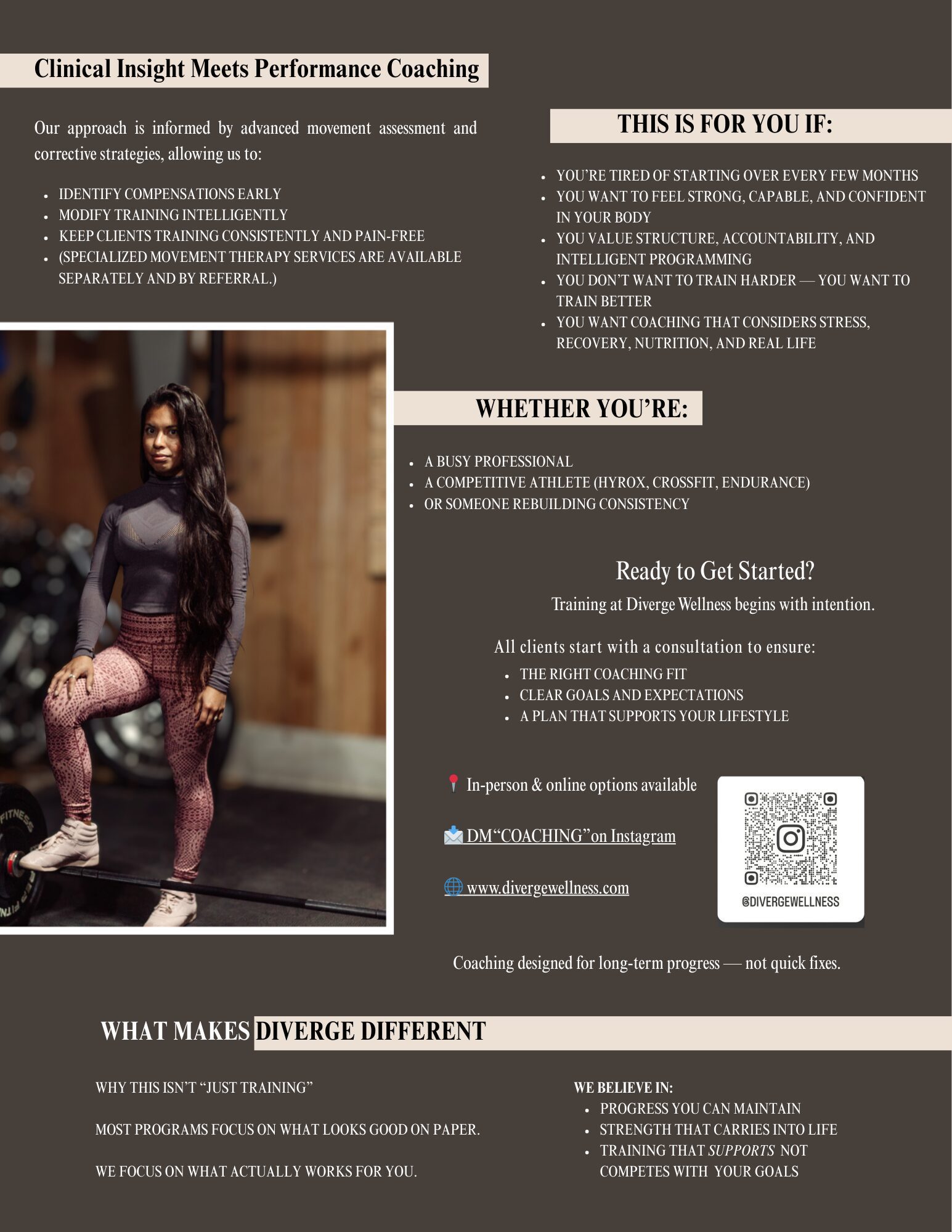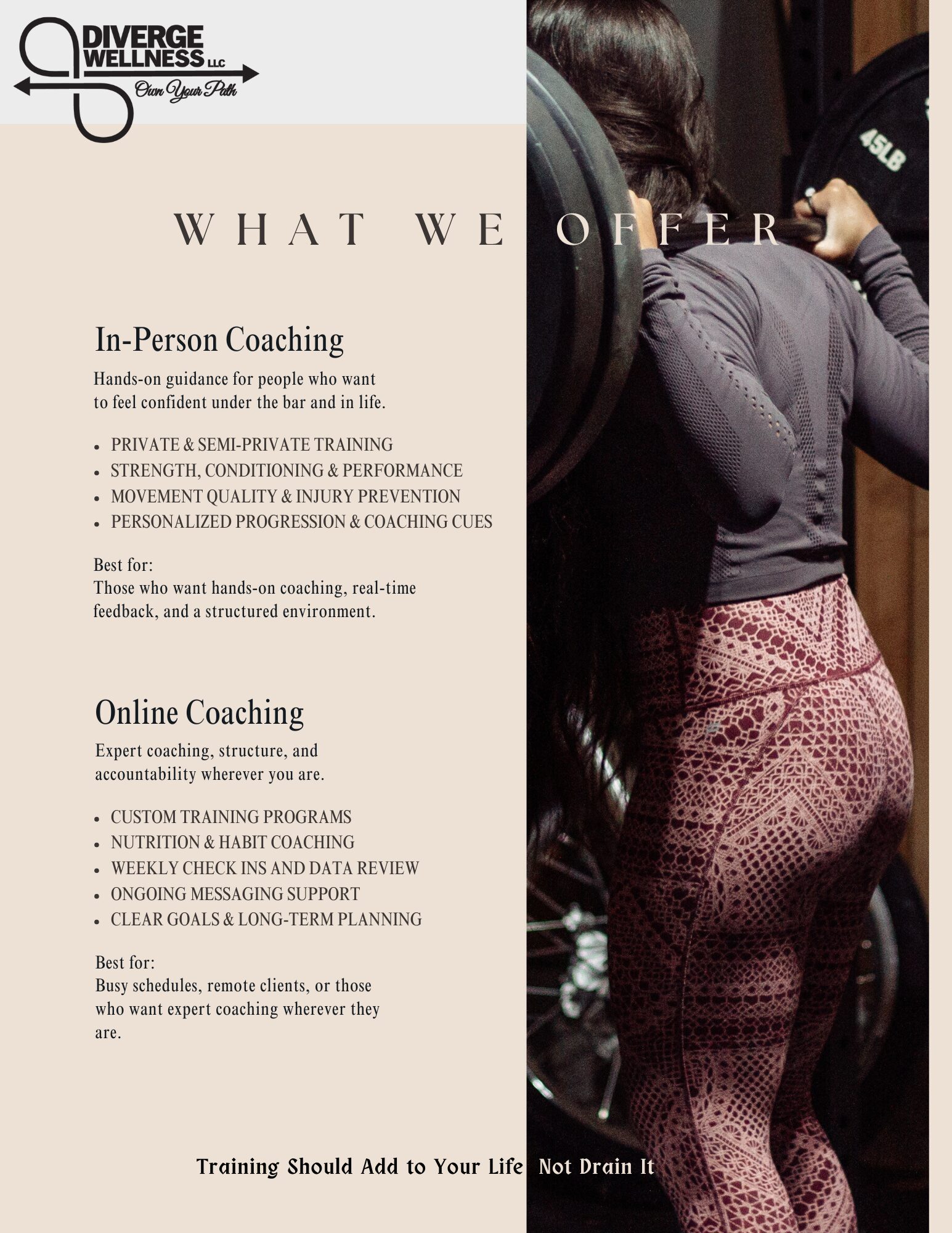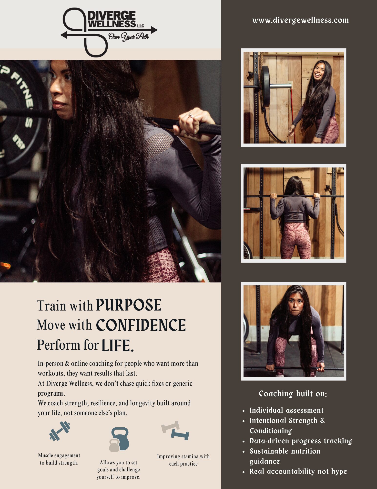 At Diverge Wellness, we focus on strength for real life. Not extremes. Not quick fixes. Not one-size-fits-all programs. Our approach centers on helping individuals move better, feel stronger, and build confidence in their bodies through consistent, intentional training that supports long-term quality of life.